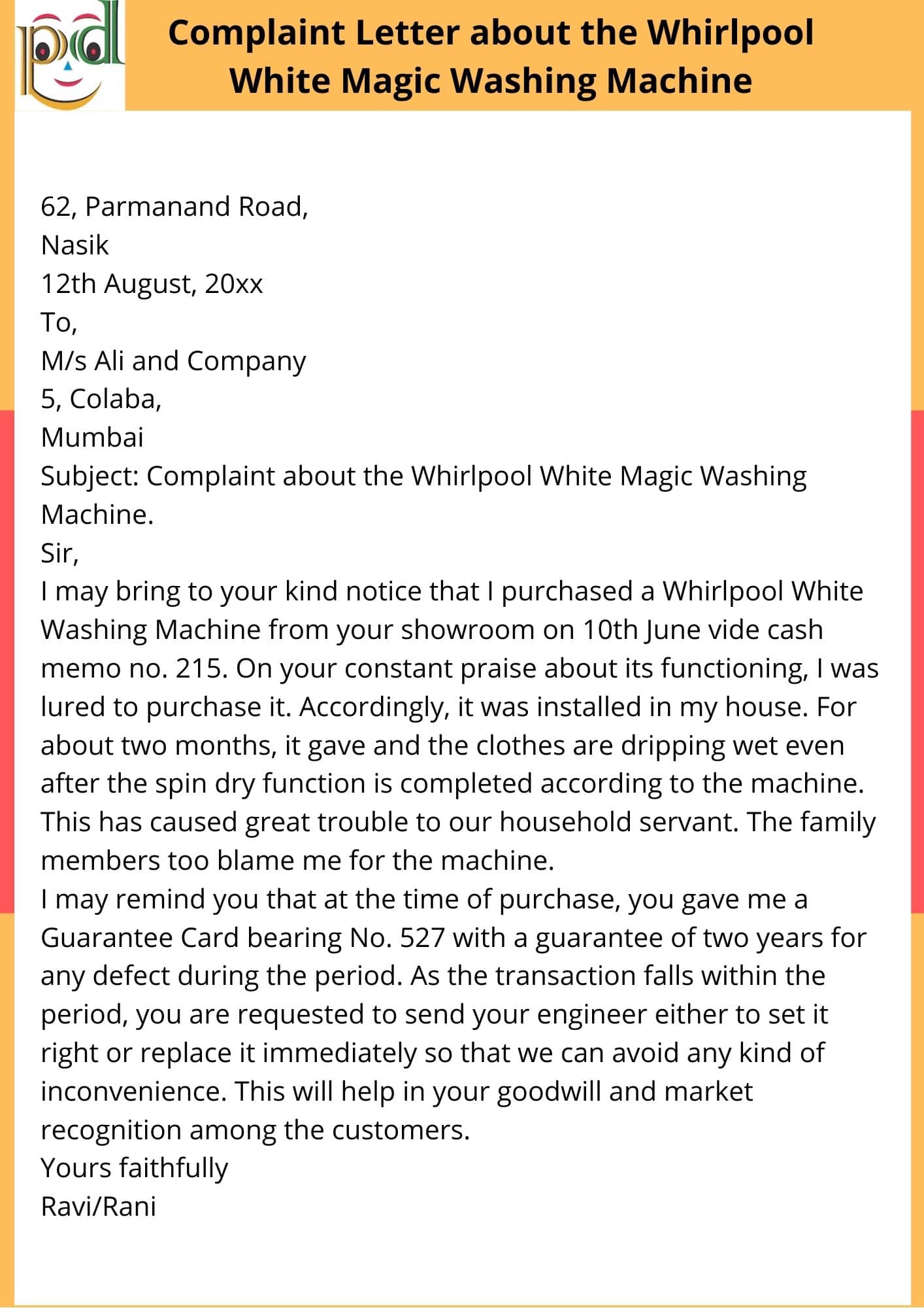 Question: You are Ravi/Rani living at 62, Parmanand Road, Nasik. Write a letter/application to Messers Ali and Company, 5, Colaba, Mumbai stating your complaint about a gadget, manufactured by them, that you have bought recently Whirlpool White Washing Machine.