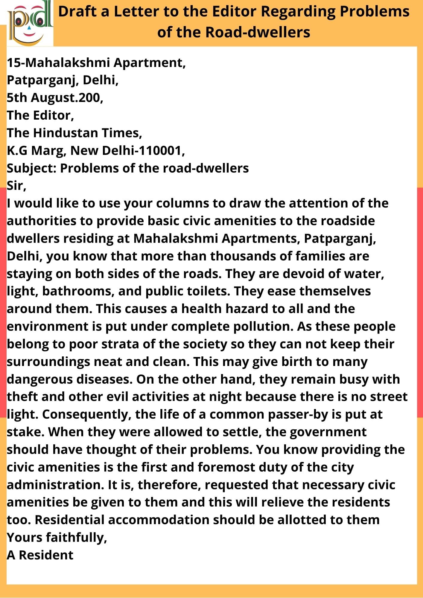 Question: You are a resident of Mahalakshmi Apartments, Patparganj, Delhi. Your residential area is flooded with roadside dwellers who are deprived of the basic civic amenities like light, public toilets, and bathrooms. Write a letter to the editor of”the Hindustan Times”, highlighting the problem of these roadside dwellers, and also the problems posed by them to the public. Give suggestions for improvement.