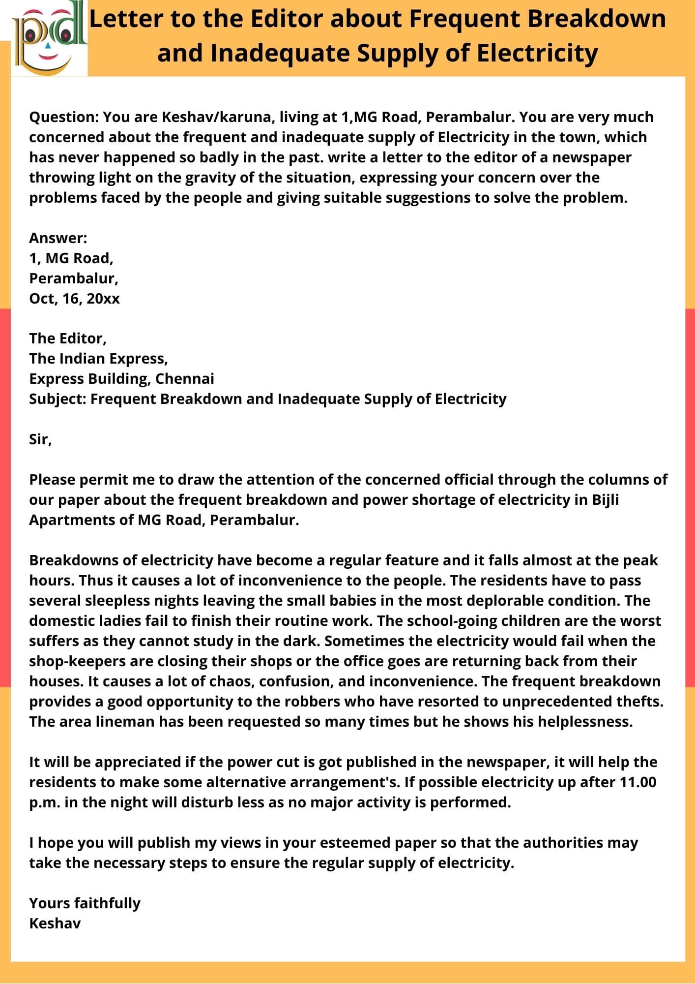 Question: You are Keshav/karuna, living at 1, MG Road, Perambalur. You are very much concerned about the frequent and inadequate supply of electricity in the town, which has never happened so badly in the past. write a letter to the editor of a newspaper throwing light on the gravity of the situation, expressing your concern over the problems faced by the people and giving suitable suggestions to solve the problem.