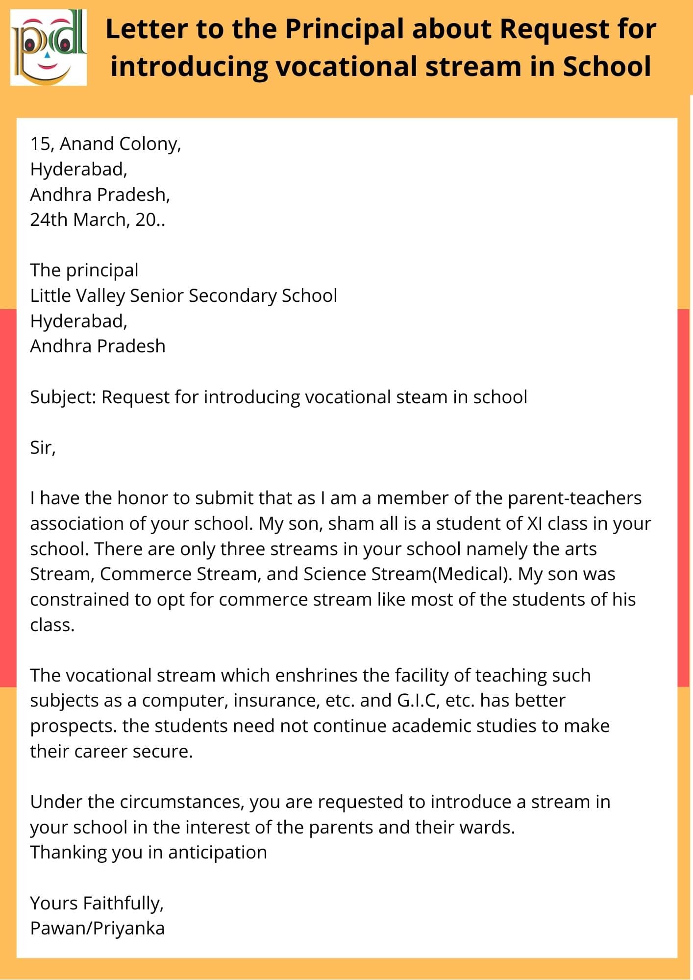 Hello Friends! Today we will learn about How to Write a letter to the Principal about a Request for introducing a vocational stream in School.