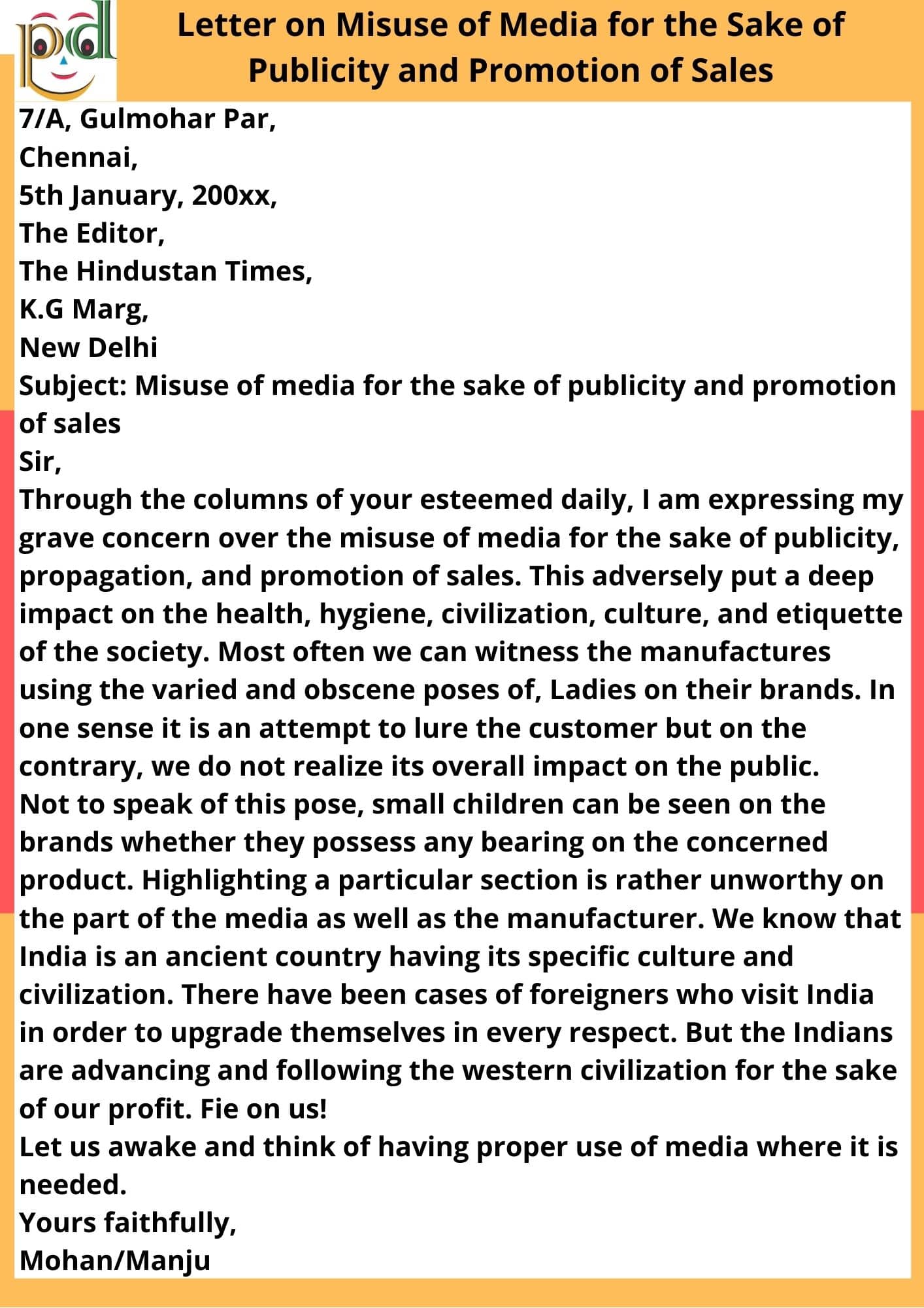 Question: Write a Letter/Application to the editor of a national daily expressing your concern over the misuse of media for the sake of publicity and promotion of sales. You are Mohan/Manju 7/A Gulmohar Park, Chennai.