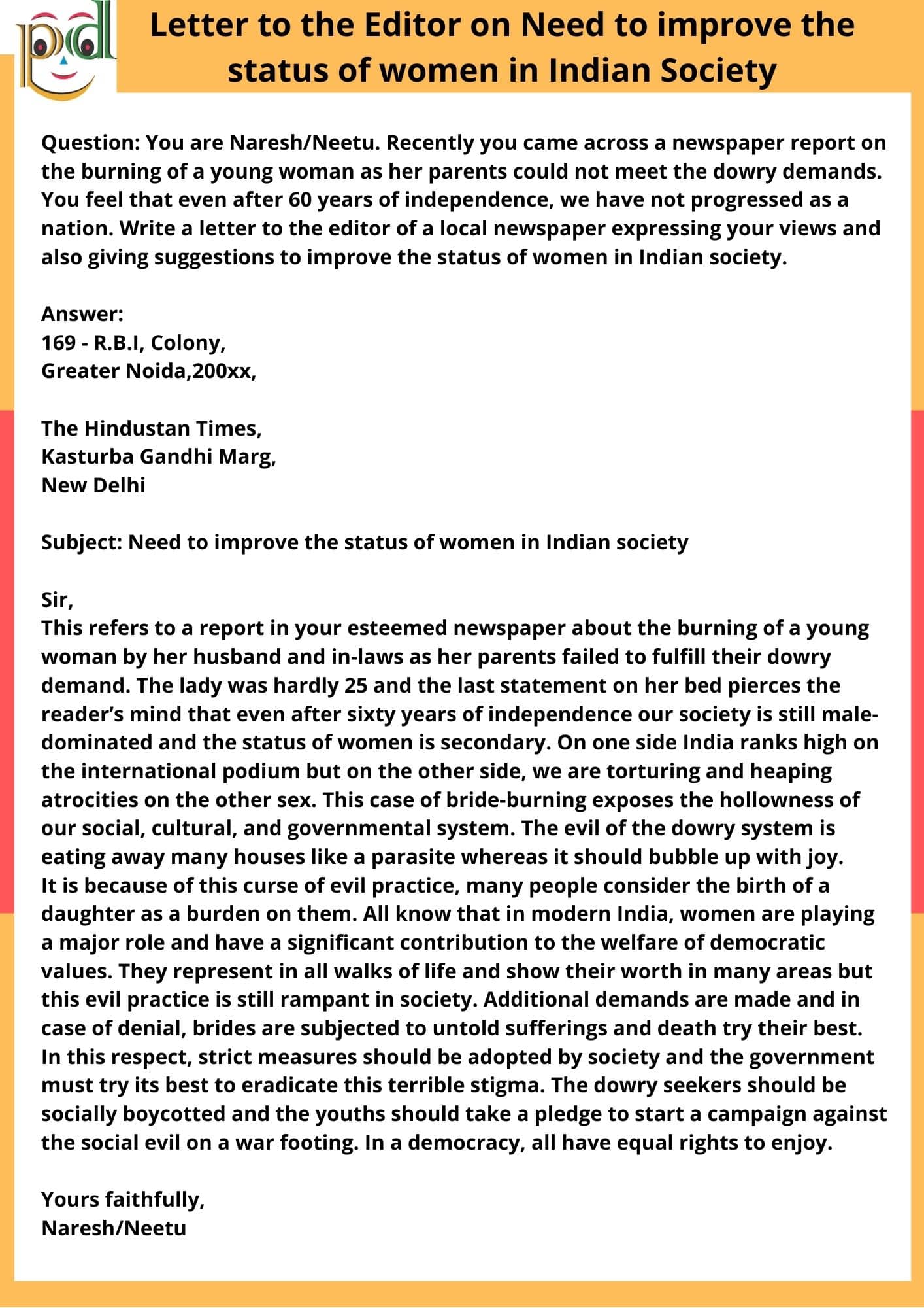 If you want to know more about how to write a Letter to the Editor on Need to improve the status of women in Indian Society. For any query about this topic comment below.