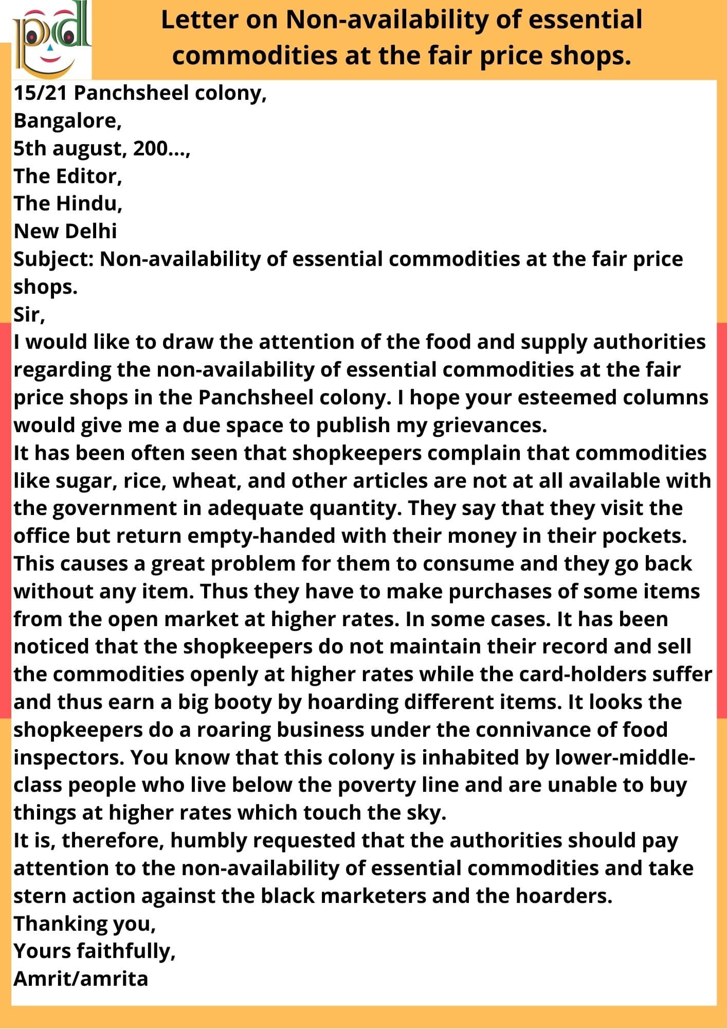 Draft a letter about the Non-availability of essential commodities at the fair price shops- Download PDF