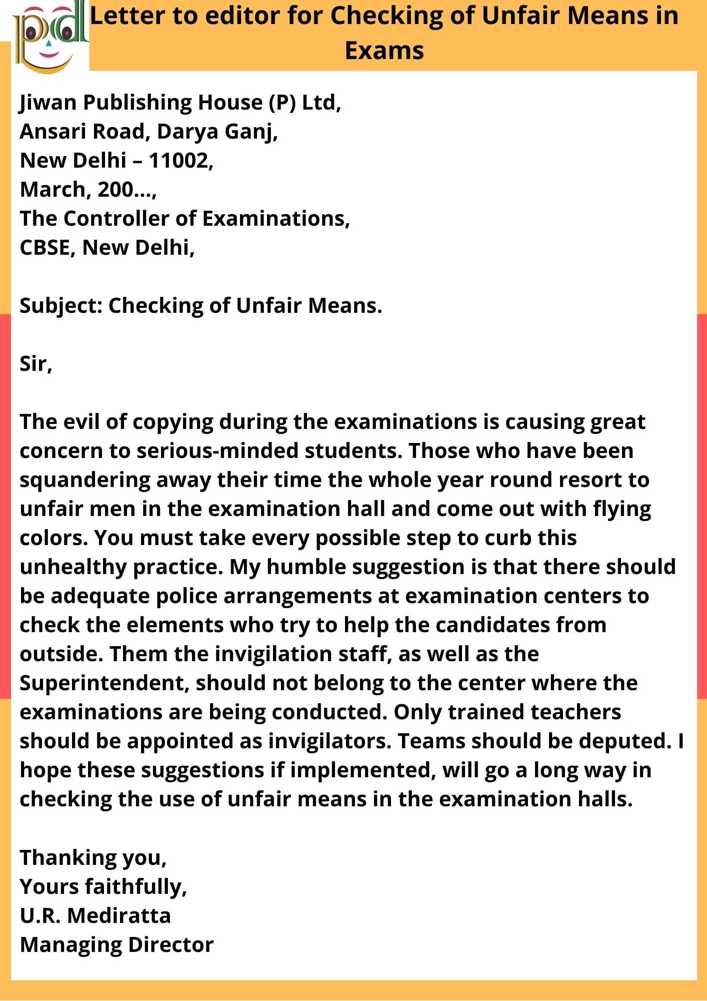 Question: R. Mediratta, the Managing Director of Jiwan Publishing House (O) Ltd. Is disturbed at the use of unfair means in the examination halls. He writes a letter to the Controller of Examinations, CBSE, New Delhi, suggesting concrete steps to check the use of unfair means during examination.