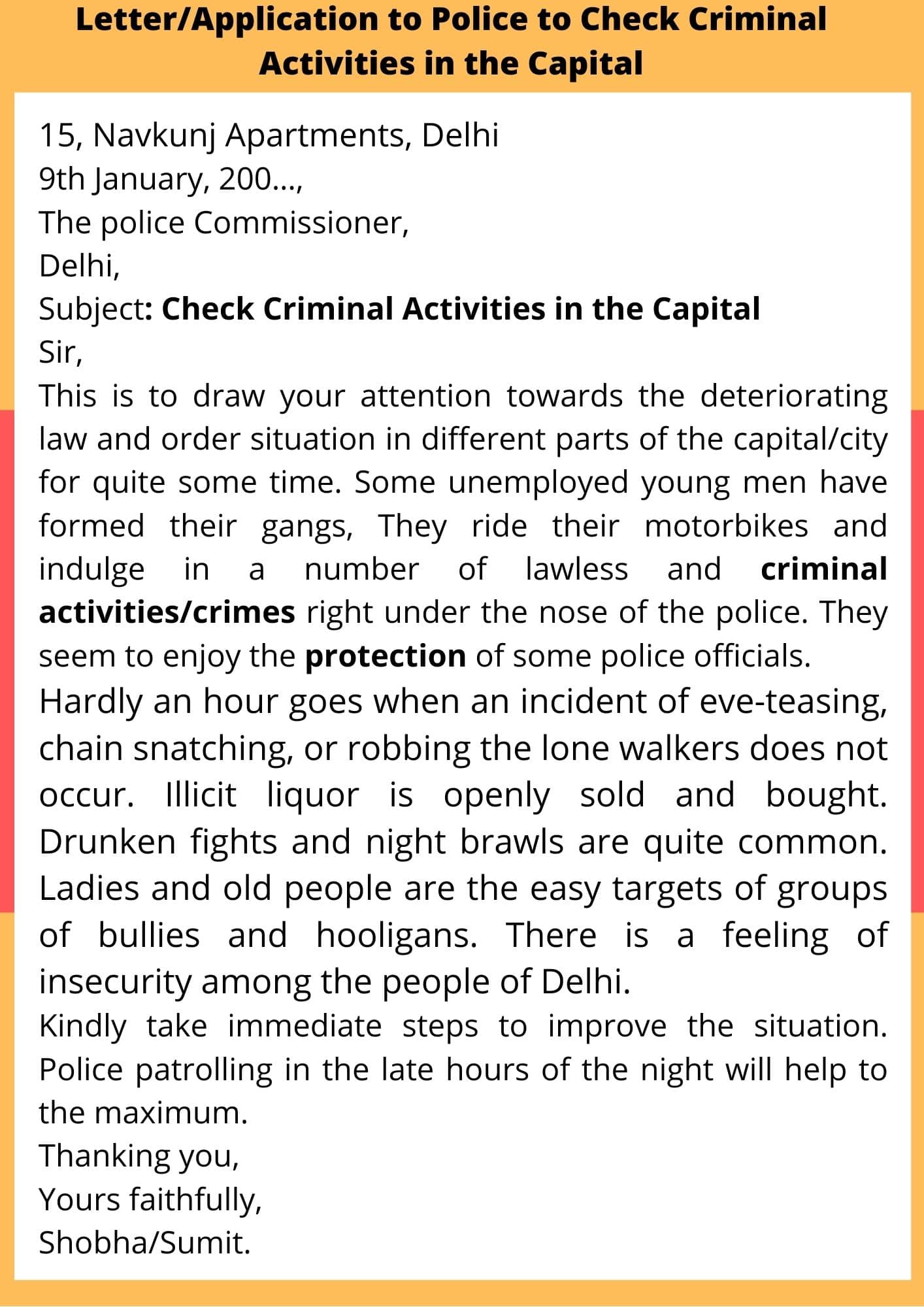 Hello Friends, we are going to describe how to write a letter/application to the Police Commissioner to check criminal activities in the capital and tackle this problem.