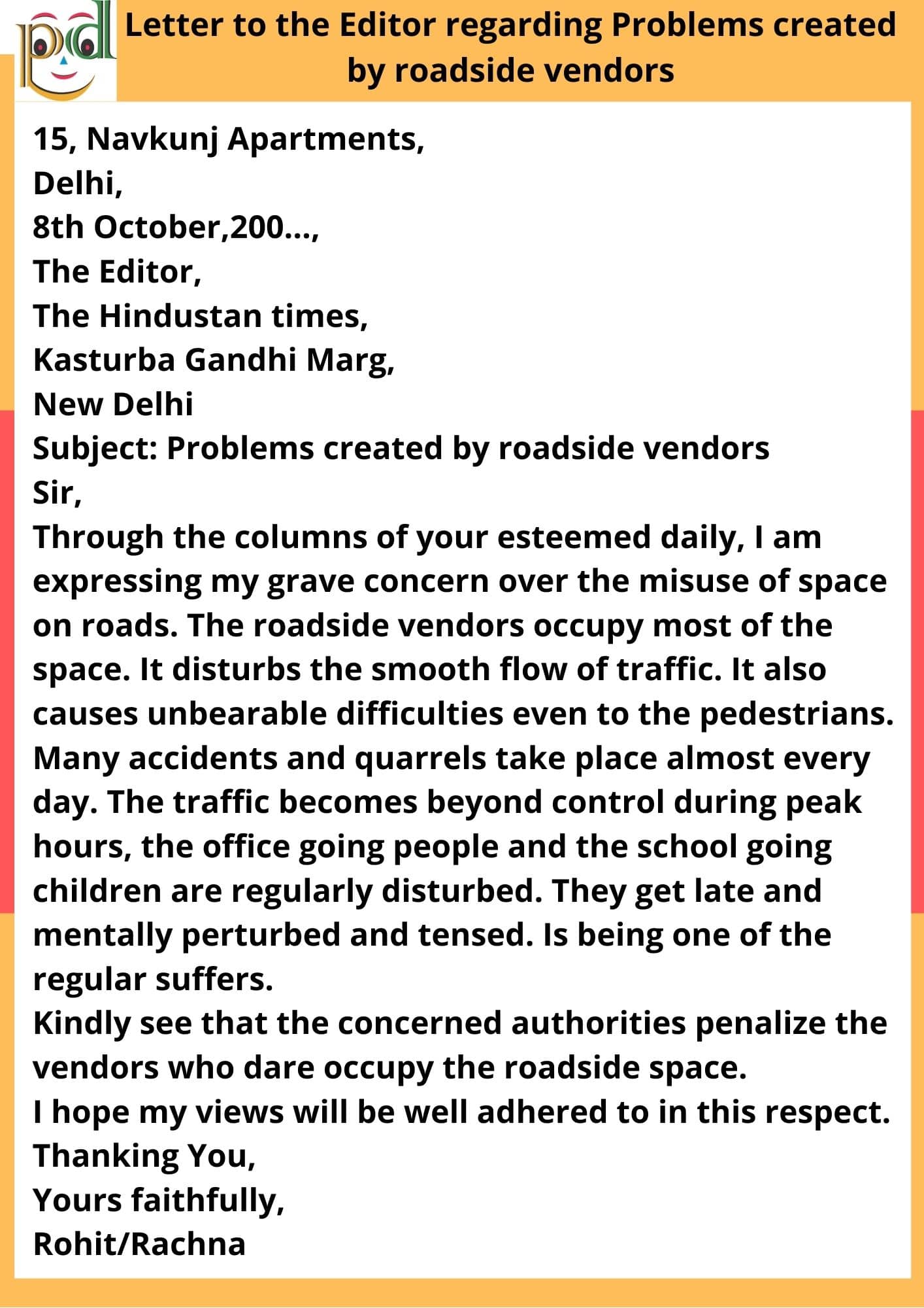 Question: Roadside vendors occupy most of the space on roads disturbing the flow of traffic and causing difficulties even to the pedestrians. Write a letter to the editor of a national daily expressing your views and suggesting ways and means to curb this problem. You are Rohit/Rachna, 15 Navkunj Apartment, Delhi.
