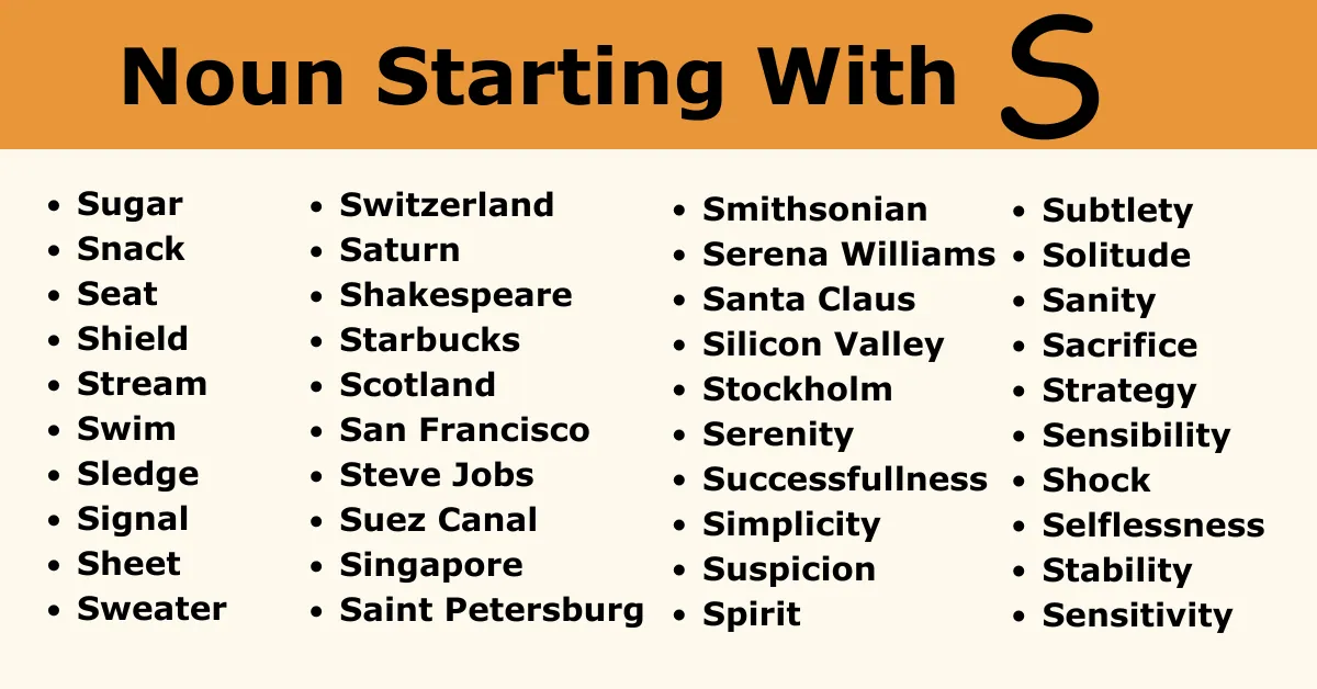 Hello students, Today, we’re going to explore noun start with s. What are the examples of nouns, you might wonder? Nouns are words that describe people, places, things, or animals.