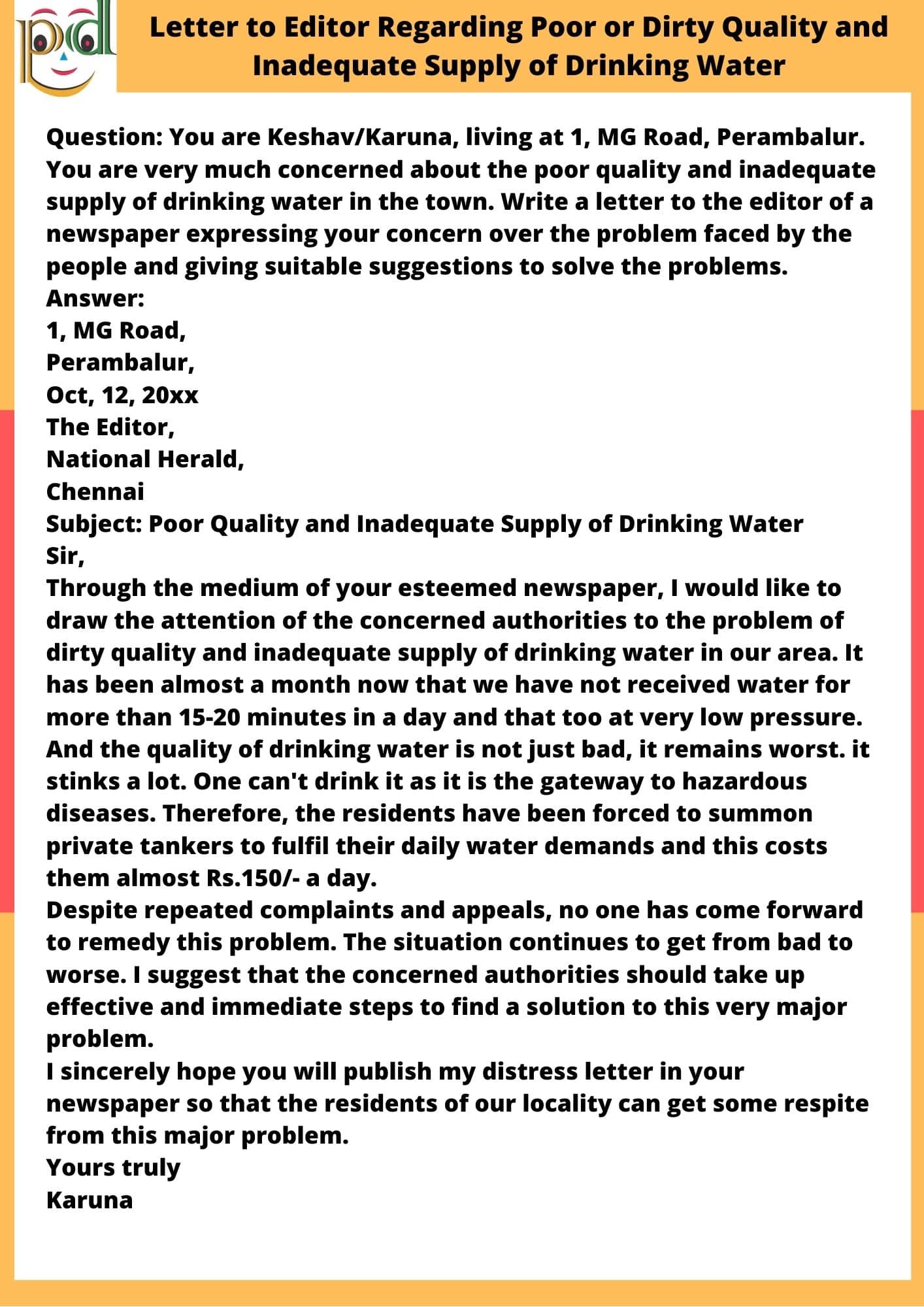Question: You are Keshav/Karuna, living at 1, MG Road, Perambalur. You are very much concerned about the poor quality and inadequate supply of drinking water in the town. Write a letter to the editor of a newspaper expressing your concern over the problem faced by the people and giving suitable suggestions to solve the problems.