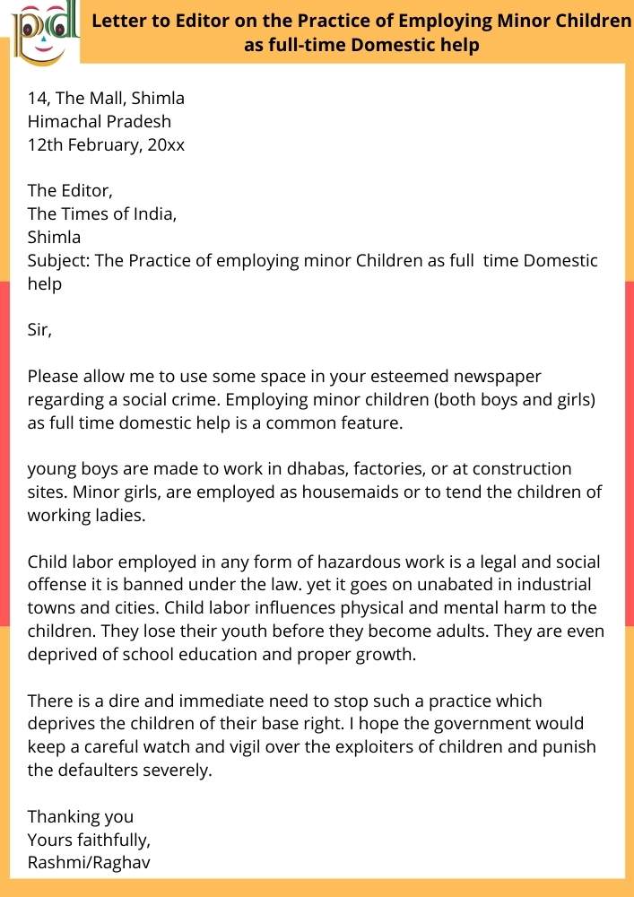 Question: Employing minor children, both boys and girls, as full time domestic help is a common feature. Write a letter to the editor, “The Times of India” advocating the need to stop such a practice which deprives the children to their basic rights, You are Rashmi/Raghav living as 14, The Mall Shimla.