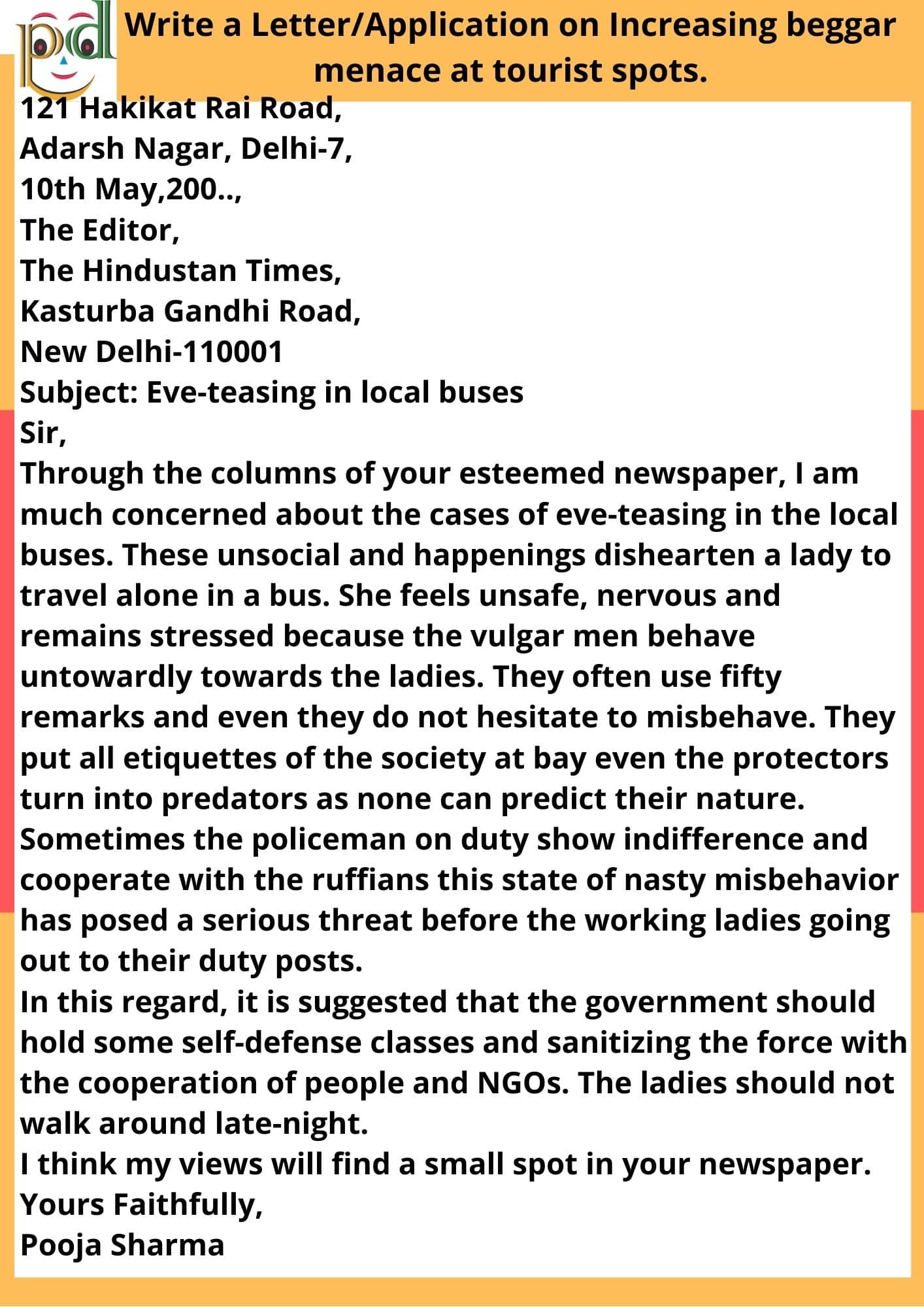 Question: You are Pooja Sharma, a citizen of Delhi. You feel deeply conferences by the growing apathy of people towards eve-teasing in local buses. Write a letter to the editor of a newspaper expressing your deep concern for the problem and suggesting ways to which women would ensure their own safety.