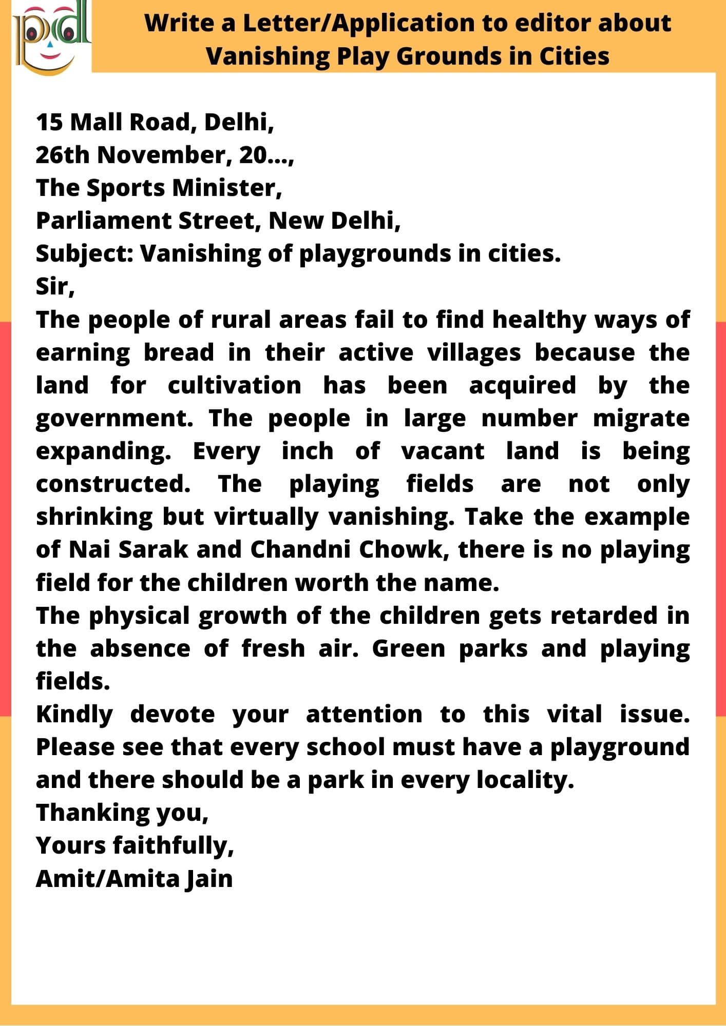 Question: People are migrating from rural areas to the cities in search of jobs. Consequently, in the fast-expanding cities, children find that their playing fields are shrinking or simply vanishing. Write a letter to the Sports Minister of your state drawing his attention to this issue. Make suggestions to cope with this situation. You are Amit/Amita Jain, 15 Mall Road, Delhi.